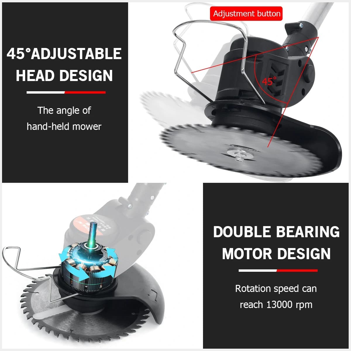 Η άκρη του θαμνοκοπτικού μπορεί να πάρει κλιση μέχρι 45 μοίρες, για να σας βολέψει στο κόψιμο χόρτων, βάτων ή χοντρόκλαδων θάμνων.