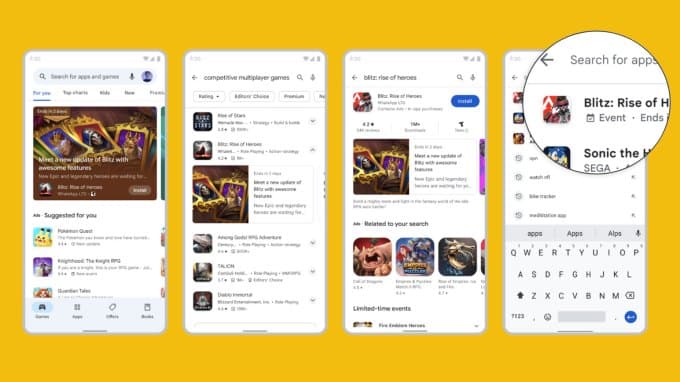 Το Play Store θα ενσωματώνει επίσης εκδηλώσεις εντός εφαρμογής σε νέα μέρη, συμπεριλαμβανομένων των ειδοποιήσεων του Play Store, της ενότητας Για εσάς στις καρτέλες Εφαρμογές και Παιχνίδια στην εφαρμογή Play Store, στα αποτελέσματα αναζήτησης του Play Store, κάτω από τα αποτελέσματα αναζήτησης για ένα συγκεκριμένο app με τον τίτλο της, ακόμη και στην ίδια την οθόνη Αναζήτησης, προτού πληκτρολογήσετε ένα ερώτημα, πάνω από άλλες συστάσεις. Η Google εθεάθη πρόσφατα να δοκιμάζει διαφημίσεις και σε αυτό το σημείο.