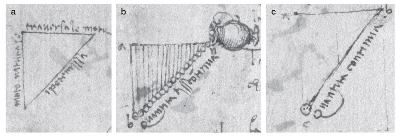 διαγραμμάτων του da Vinci από μηχανικούς του Caltech University, αποκαλύπτει πως ο διάσημος καλλιτέχνης και εφευρέτης είχε αναγνωρίσει τις ιδιότητές της βαρύτητας ως μία μορφή επιτάχυνσης. Συγκεκριμένα, τριγωνικά σχέδια έδειχναν τη σχέση μεταξύ της φυσικής κίνησης του αντικειμένου, της εξαναγκασμένης κίνησης προς μία κατεύθυνση και την εξισορρόπηση αυτής της κίνησης ενδιάμεσα. Ο da Vinci συνειδητοποίησε πως αν η άμμος που χυνόταν από ένα βάζο το οποίο είχε πετάξει σε ευθεία, με την ίδια