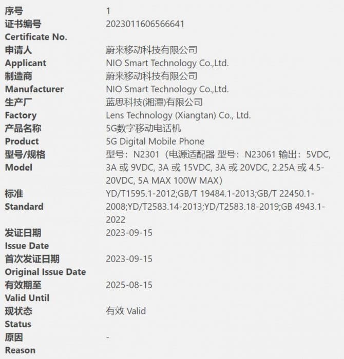 Για τους γνώστες της τεχνολογίας, το Antutu, μια διάσημη πλατφόρμα συγκριτικής αξιολόγησης τηλεφώνων, έχει ήδη δώσει μια ματιά στο εσωτερικό του κινητού. Με το Qualcomm Snapdragon 8 Gen 2 SoC στην καρδιά του, που πλαισιώνεται από 12 GB μνήμης RAM και 1 TB αποθηκευτικού χώρου, φαίνεται ότι η Nio δεν τσιγκουνεύεται τις προδιαγραφές. Α, και για εκείνους που θέλουν να προσέξουν τις επιλογές αποθήκευσης, υπάρχει μια επιλογή μεταξύ “RAM 16 GB + ROM 1 TB” και “RAM 16 GB + ROM 512 GB”. Και ποιος κατασκευάζει αυτήν τη συσκευή; Χάρη στη διαδικασία πιστοποίησης κινητών συσκευών της Κίνας, γνωρίζουμε τώρα ότι είναι η τεχνολογία φακών, που προέρχεται από το Χουνάν. Αυτή δεν είναι η πρώτη τους κατασκευή. Προμηθεύουν την Apple με φακούς και σχετικά εξαρτήματα για τα iPhone τους και έχουν μια σχέση με την Tesla που εκτείνεται σε πάνω από δύο χρόνια. Η Nio έλαβε το πιστοποιητικό CCC στις 15 Σεπτεμβρίου, αποκαλύπτοντας περισσότερες από τις προδιαγραφές του επερχόμενου τηλεφώνου της.