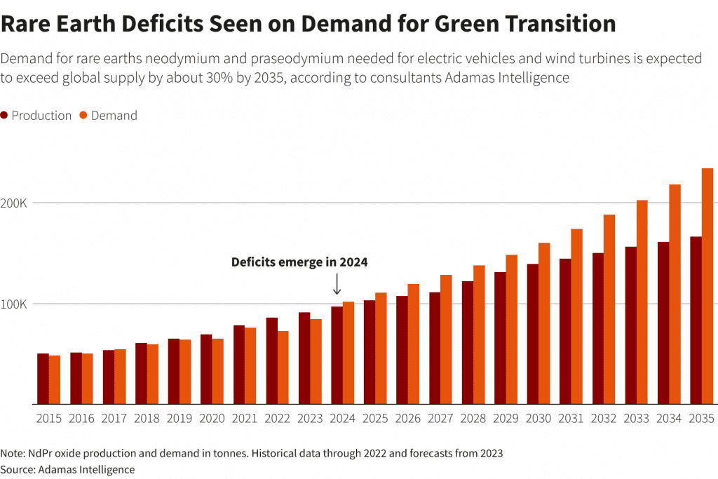 Τα έξι έργα, που αφορούν την επεξεργασία υλικού από ορυκτές άμμους, τα λιπάσματα και εργασίες για το σιδηρομετάλλευμα, στοχεύουν στην παραγωγή άνω των 10.000 τόνων βασικών στοιχείων νεοδυμίου και οξειδίου του πρασεοδυμίου (NdPr) έως το 2027, σύμφωνα με ανάλυση του Reuters και της εταιρείας συμβούλων Adamas Intelligence.