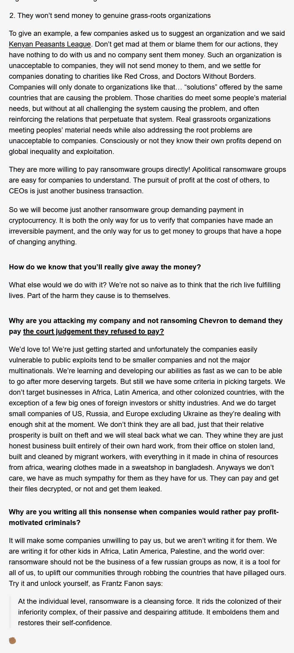 Αυτή η απαίτηση λύτρων είναι πολύ ασυνήθιστη και, αν είναι ειλικρινής, τοποθετεί την επιχείρηση περισσότερο στη σφαίρα του χακτιβισμού.