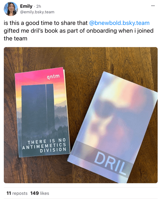 κατά την ένταξή μου στην ομάδα (επίσης απεικονίζεται ένα βιβλίο που ονομάζεται “There Is No Antimemetics Division”, το οποίο ακούγεται σαν κάτι που πρέπει να διαβάσω το συντομότερο δυνατόν). Αυτό το γεγονός φαινόταν λίγο πολύ τέλειο για να υποστηρίξω τη διατριβή μου ότι η Bluesky θα πετύχει καλλιεργώντας σκόπιμα shitposting, οπότε έλεγξα ξανά με τον Newbold για να βεβαιωθώ ότι αυτό ήταν νόμιμο. Απάντησε: «Είναι η δημόσια δηλωμένη πολιτική της Bluesky PBLLC ότι όλοι οι νέοι υπάλληλοι θα λαμβάνουν τα καλύτερα tweets @dril.bsky.social σε έντυπη μορφή». Κάντε αυτό που θέλετε.