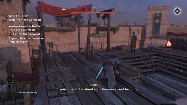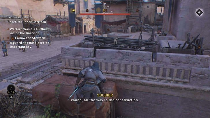 • Βήμα 3 – Ο Αγωνάρχης θα περπατήσει ακριβώς μέσα από την κύρια αυλή όπου οι στρατιώτες εκπαιδεύονται – προφανώς όχι κάπου που μπορείτε να ακολουθήσετε. Κολλήστε στον τοίχο που ακολουθείτε. Υπάρχει μόνο