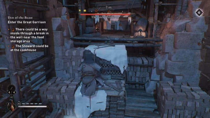 • Βήμα 1 – Προχωρήστε σε όλη τη διαδρομή κατά μήκος του νοτιοδυτικού τοίχου του Φρουραρχείου. Θα περάσετε από μια περιοχή κατασκευής που μπορείτε να γλιστρήσετε, αλλά θα την προσπεράσετε. Θα φτάσετε σε μερικά κιβώτια στα οποία μπορείτε να σκαρφαλώσετε και ο Αγωνιστής θα είναι ακριβώς μπροστά σας στον χώρο της κουζίνας. Πέστε κάτω και κάντε μια συνομιλία μαζί του.