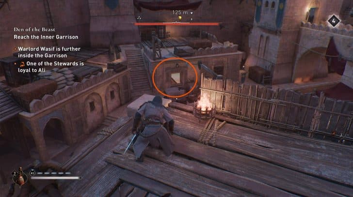 • Βήμα 5 – Θα φτάσετε γρήγορα σε ένα σημείο που σας επιτρέπει να κοιτάξετε κάτω σε μια αίθουσα όπου ο Πολέμαρχος/Γουασίφ κάνει παρέα. Περιμένετε να διαλυθούν λίγο οι φρουροί και μετά αποσπάστε την προσοχή του Wasif με μια καπνογόνα ή κάποιο άλλο εργαλείο. Ανεβείτε στο μπαλκόνι στην άλλη πλευρά του θαλάμου, μετά πηγαίνετε στο ειδικό σημείο δολοφονίας που επισημαίνεται με το πορτοκαλί εικονίδιο του κρανίου και πάρτε τη σταγόνα στον στόχο σας.