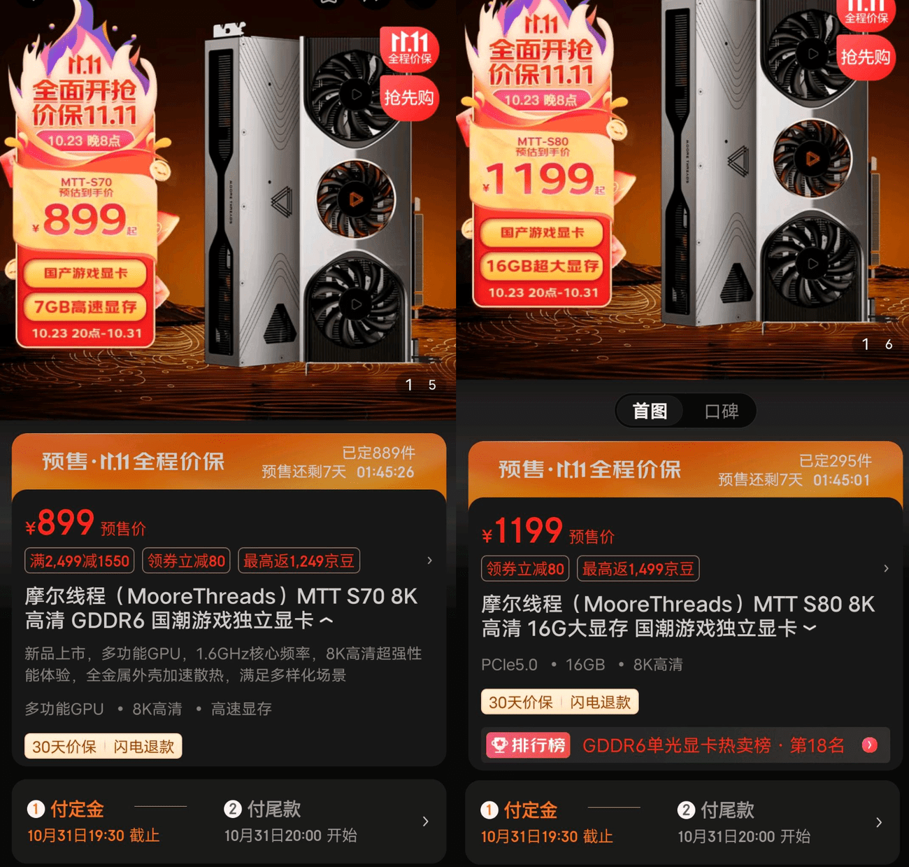 Οι κινέζοι έμποροι λιανικής φιλοξενούν αυτήν τη στιγμή τις προσφορές του Φεστιβάλ 11.11, πράγμα που σημαίνει ότι οι καταναλωτές θα μπορούν να βρουν εξαιρετικές προσφορές σε εξαρτήματα υπολογιστή, όπως CPU, GPU, μητρικές πλακέτες και πολλά άλλα. Μεταξύ αυτών των προσφορών είναι οι Moore Threads MTT S80 και MTT S70 GPU που έχουν φτάσει στη χαμηλότερη τιμή τους.