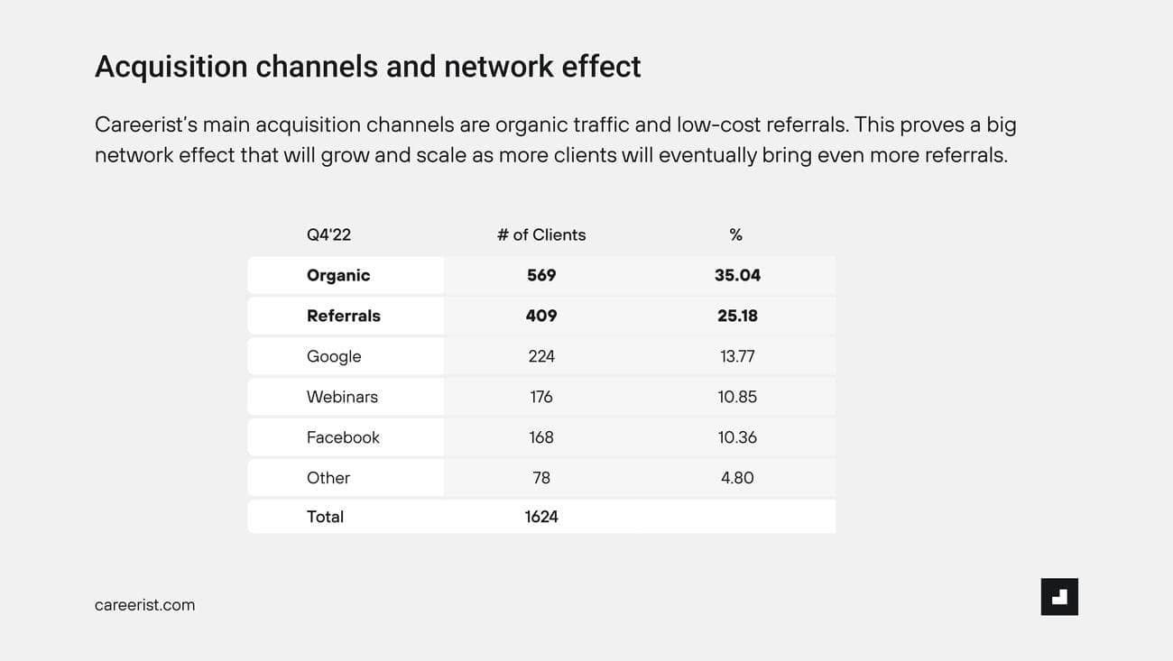 Στις διαφάνειές της, η εταιρεία ισχυρίζεται ότι λαμβάνει το 35% της επισκεψιμότητάς της οργανικά και ένα άλλο 25% από παραπομπές. Αυτά είναι δύο εξαιρετικά ισχυρά, χαμηλού κόστους κανάλια απόκτησης που μπορούν να οδηγήσουν σε εξαιρετικούς πελάτες υψηλής αξίας. Αλλά αυτό είναι δίκοπο μαχαίρι. Οι παραπομπές γενικά κλιμακώνονται καλά παράλληλα με άλλα κανάλια: Εάν λάβετε παραπομπή 0.2 κατά μέσο όρο ανά πελάτη και αποκτήσετε 10 πελάτες, λαμβάνετε δύο “δωρεάν” πελάτες λόγω παραπομπών. Η πρόκληση είναι με την οργανική κυκλοφορία, η οποία είναι πολύ πιο δύσκολο να κλιμακωθεί στη ζήτηση. Με άλλα λόγια, μόλις κλείσετε έναν γύρο χρηματοδότησης 8 εκατομμυρίων δολαρίων, πώς θα επιταχύνετε δραματικά τις πωλήσεις σας;