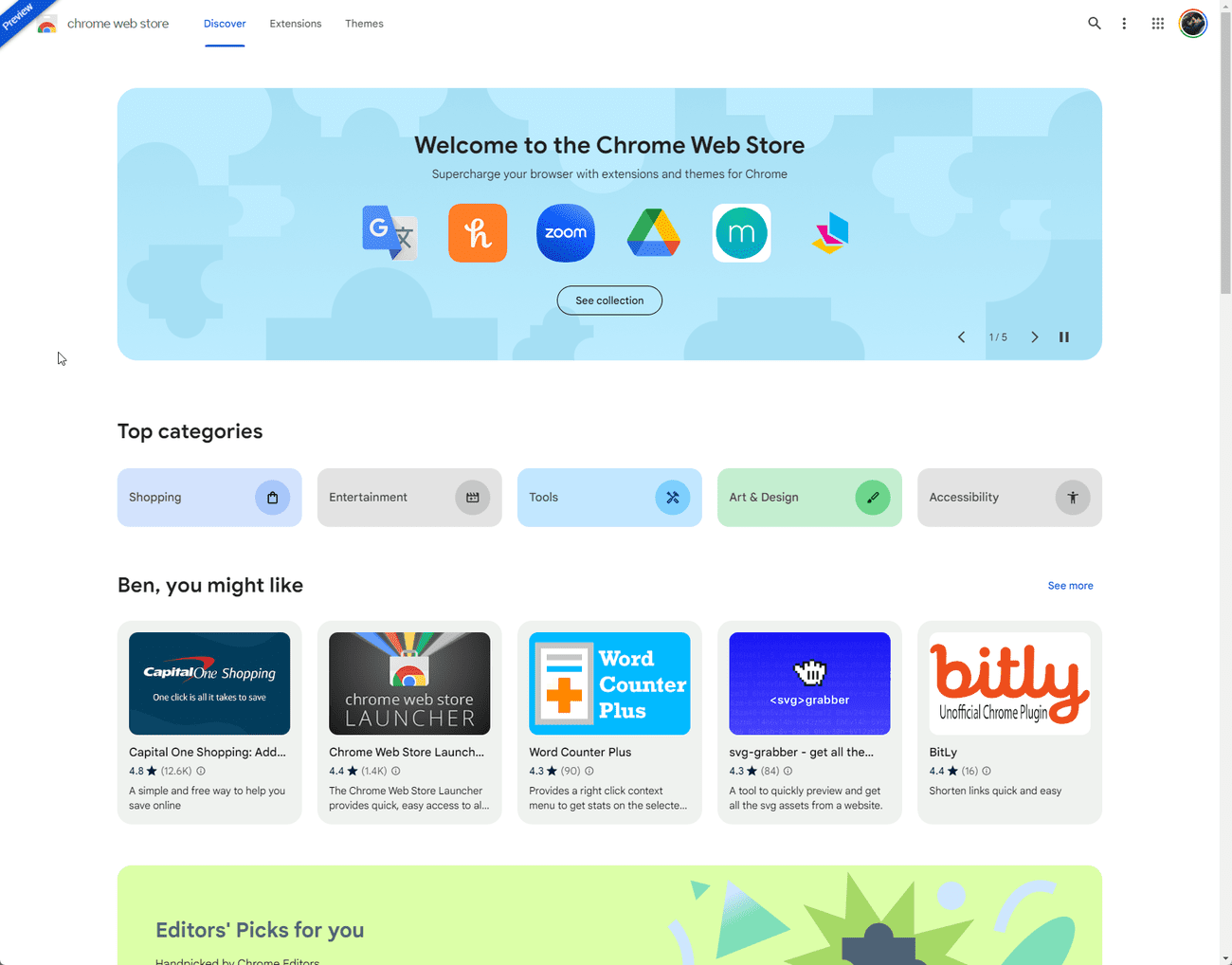 . Υπάρχει μια περιστρεφόμενη λίστα επισημασμένων επεκτάσεων και θεμάτων στην αρχική σελίδα “Discover”, με κατηγορίες, προτάσεις και άλλα παρακάτω.