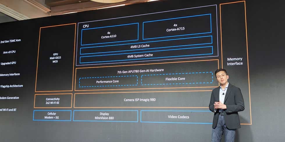 Αυτό που υπόσχεται σοβαρά τα τηλέφωνα με αυτό το SoC είναι το πόση προσπάθεια κατέβαλε η MediaTek για να το κάνει όχι μόνο έτοιμο για τεχνητή νοημοσύνη, αλλά και να το χτίσει ώστε να χρησιμοποιεί γενετικό AI στην καθημερινή χρήση. Το SoC είναι εξοπλισμένο με επεξεργαστή 7ης γενιάς APU 780, ο οποίος τραβάει πολύ βαριά τεχνητή ανύψωση. Συνολικά, η νέα APU προσφέρει 3,3 φορές περισσότερη υπολογιστική ισχύ και χρησιμοποιεί νέα, διευρυμένη υποστήριξη για μοντέλα μεγάλων γλωσσών και Stable Diffusion.