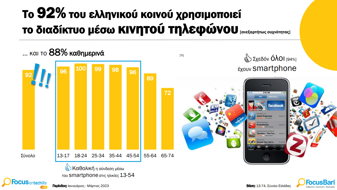 Όλοι οι Έλληνες (94%) έχουν smartphone, το οποίο χρησιμοποιούν καθημερινά για να μπαίνουν στο internet