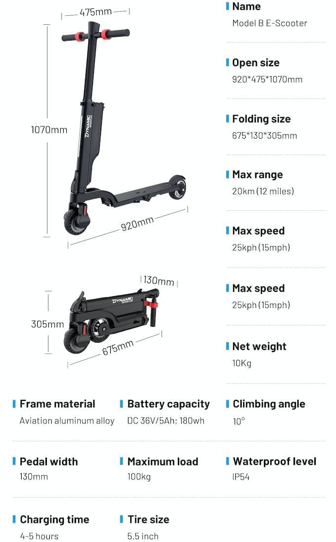 Το Dynamic Scooter Model B ξεχωρίζει για τις μικροσκοπικές του διαστάσεις, την ευκολία μεταφοράς μαζί μας και τα καλά χαρακτηριστικά για την τιμή του. Υστερεί σε ισχύ, άνεση και αυτονομία, αλλά μπροστά στην κορυφαία φορητότητα που προσφέρει, κάποιοι μπορεί να κάνουν τα στραβά