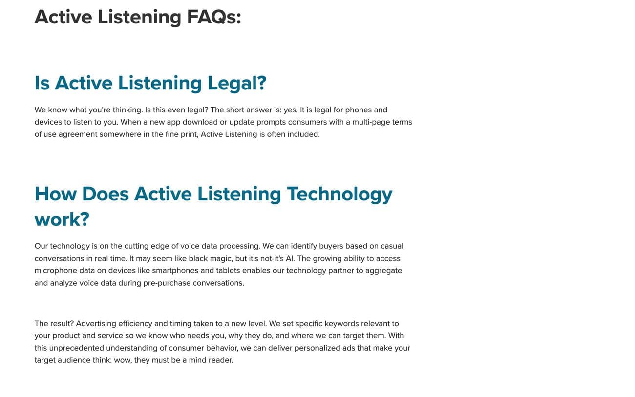 «Ξέρουμε τι σκέφτεστε. Είναι αυτό νόμιμο; Είναι νόμιμο για τα τηλέφωνα και τις συσκευές να σας ακούνε. Όταν μια νέα λήψη ή ενημέρωση εφαρμογών προτρέπει τους καταναλωτές με μια πολυσέλιδη συμφωνία χρήσης κάπου στα ψιλά γράμματα υπάρχει και το Active Listening» αναφέρει