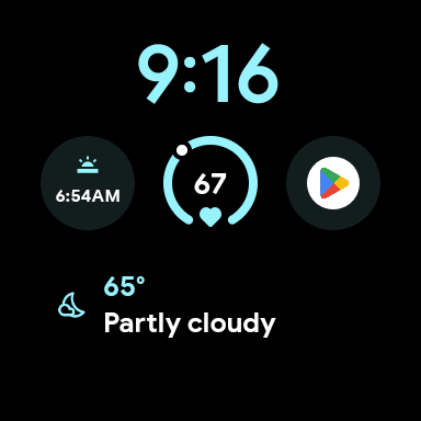 Η ημέρα/ημερομηνία συνδυάζεται με τη θερμοκρασία, την τρέχουσα κατάσταση και την υψηλή/χαμηλή πρόγνωση για την ημέρα ή όταν αναμένεται βροχή/υετό. Ένα πάτημα ανοίγει την εφαρμογή Wear OS Weather.