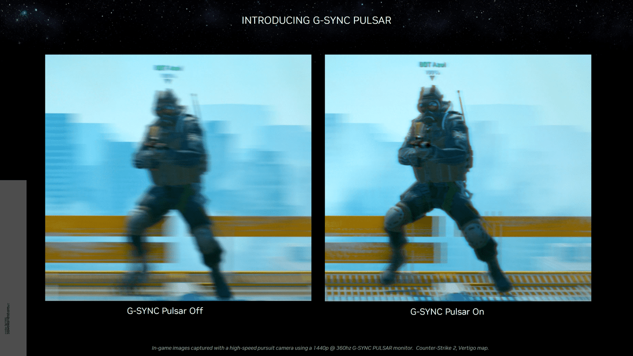 Το G-SYNC Pulsar είναι το επόμενο βήμα προς την ενεργοποίηση εκπληκτικών ταχέων ρυθμών ανανέωσης με την εφαρμογή από την πλευρά του λογισμικού. Η NVIDIA παρουσίασε ένα demo της τεχνολογίας με το Counter-Strike 2, το οποίο εκτελείται σε οθόνη 360 Hz με ενεργοποιημένο το Pulsar, έναντι με απενεργοποιημένη την τεχνολογία Pulsar, και είναι προφανές ότι η διαφορά είναι τεράστια, ειδικά όταν πρόκειται για κίνηση σαφήνεια και ορατότητα.