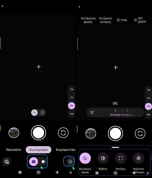 Ταυτόχρονα, το κουμπί όλων των ρυθμίσεων έχει μετακινηθεί στο κάτω αριστερό μέρος, το οποίο είναι πιο βολικό στη χρήση με το ένα χέρι. Η μόνη απουσία εδώ είναι το AWB (Auto White Balance) που είδαμε στην έκδοση 8.7, μια τεχνολογία της Google που διορθώνει και βελτιώνει τα χρώματα στις νυχτερινές λήψεις και πολλά άλλα.