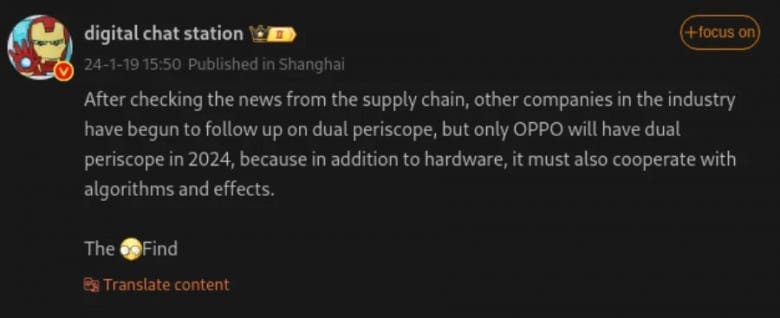 Σύμφωνα με πρόσφατη ανάρτηση στο Weibo, το Digital Chat Station, αφού συλλέξει πληροφορίες από την αλυσίδα εφοδιασμού, σημειώνει ότι ενώ άλλες εταιρείες εξετάζουν την τεχνολογία διπλού περισκοπίου, μόνο η Oppo θα προσφέρει μια τέτοια δυνατότητα εντός του 2024. Αυτό οφείλεται στο γεγονός ότι, εκτός από το απαραίτητο υλικό , οι αλγόριθμοι μετα-επεξεργασίας είναι απαραίτητοι για την επίτευξη καλών αποτελεσμάτων.
