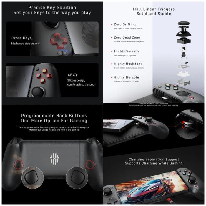 Το μπροστινό μέρος του gamepad έχει μηχανισμό ALPS, αριστερό μοχλό, κουμπιά σταυρού, κουμπί στιγμιότυπου οθόνης, κουμπί REDMAGIC, δεξί μοχλό ALPS, κουμπί ABX και κουμπί RT. Στο πίσω μέρος της συσκευής, υπάρχουν γραμμικές σκανδάλες που έχουν 256 επίπεδα αλλαγής, με διάστημα απόκρισης μικρότερο από 0,1 mm.