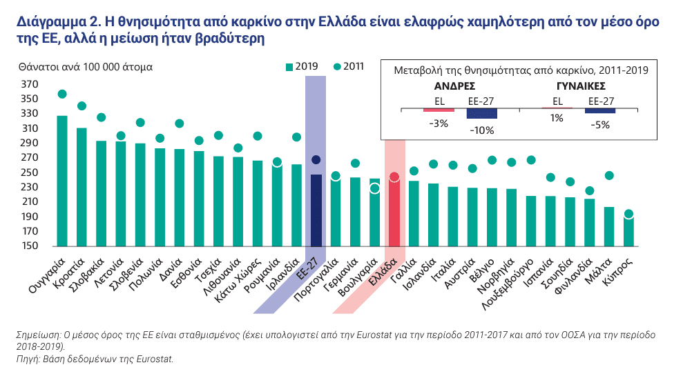 Η θνησιμότητα από καρκίνο παραμένει υψηλή και αντιπροσωπεύει το 22,5% του συνόλου των θανάτων και ποικίλλει μέχρι 1,6 φορές στις χώρες της ΕΕ+2.