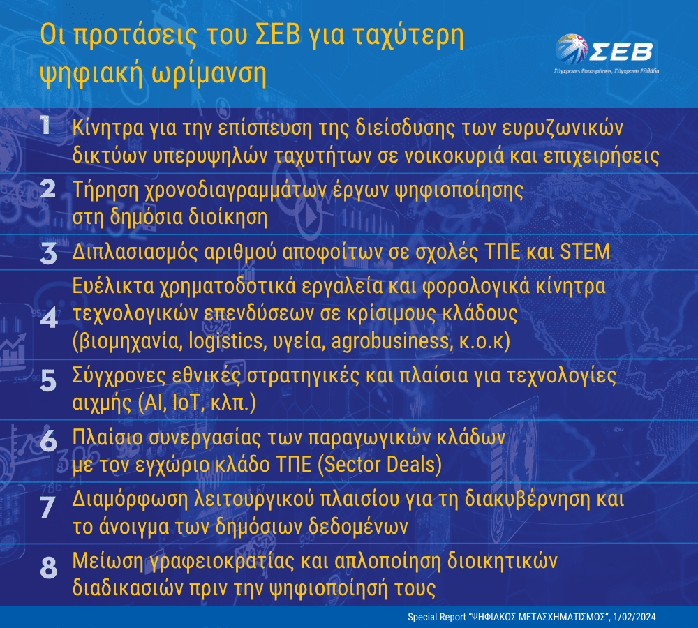 μέα Βιομηχανίας, Ανάπτυξης, Τεχνολογίας & Καινοτομίας του ΣΕΒ, δήλωσε ότι: «Για να συνεχίσει η χώρα στη θετική ψηφιακή τροχιά που χάραξε την τελευταία πενταετία, καλείται να πραγματοποιεί μικρότερα ή και μεγαλύτερα άλματα. Ένα τέτοιο άλμα θα πρέπει να αφορά στις ΜμΕ. Η διευκόλυνση της εξεύρεσης ειδικών σε τεχνολογίες πληροφορικής και επικοινωνιών και η συνεχής στήριξη με χρηματοδοτικά εργαλεία των τεχνολογικών επενδύσεων, αποτελούν απαραίτητες προϋποθέσεις ώστε να επιταχυνθεί η υιοθέτηση τεχνολογιών αιχμής από τις ελληνικές επιχειρήσεις».
