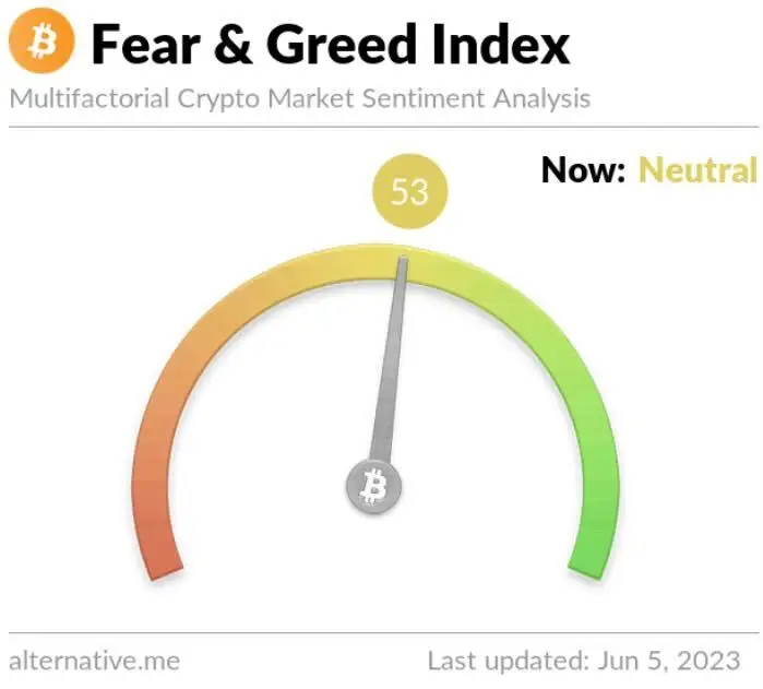 Ο δείκτης Crypto Fear & Greed της Alternative λέει επίσης ότι, το κλίμα της αγοράς κυμαίνεται γύρω από την τρέχουσα βαθμολογία του 53 – στην «Ουδέτερη» ζώνη – για σχεδόν ένα μήνα τώρα.
