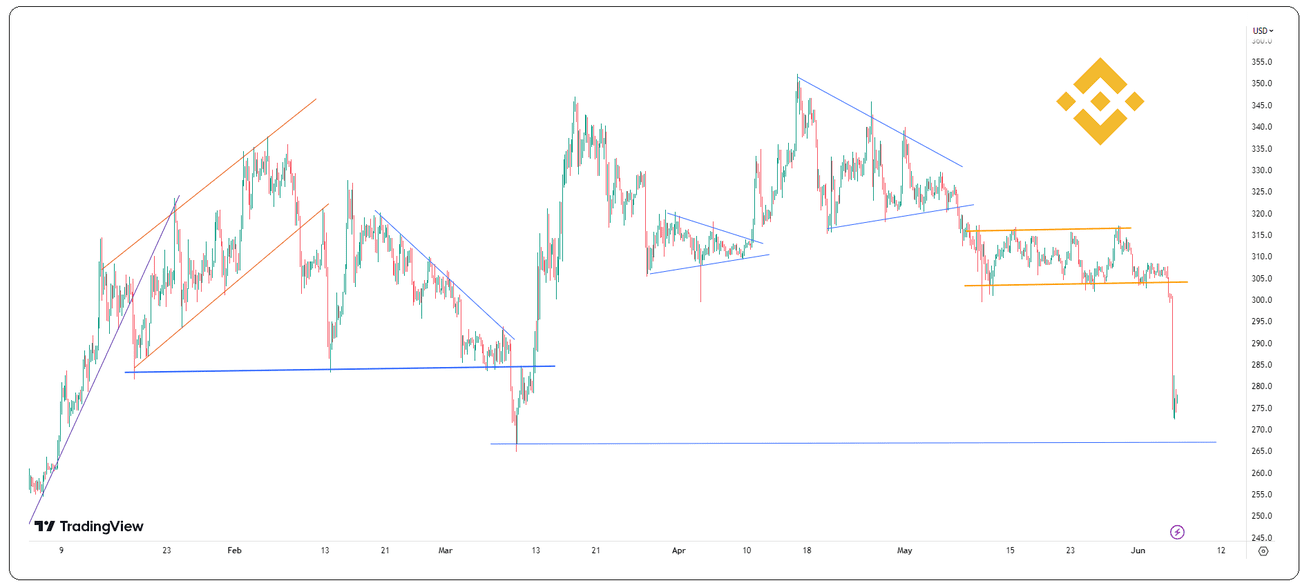 το νόμισμα της Binance. Όπως παρατηρούμε στο 4ωρο διάγραμμα, επί εβδομάδες κάποιοι κρατούσαν αυτό που ονομάζουμε «στάση αναμονής». Το «ελατήριο» όσο περνούσε ο καιρός συμπιέζονταν. Με το που βγήκε η είδηση, αμέσως εκτινάχθηκε προς τα κάτω. Ωστόσο δεν χρειάστηκε καν να φτάσει η τιμή το προηγούμενο χαμηλό του Μάρτη.