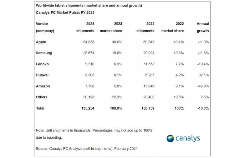 εξακολουθεί να ηγείται, όπως θα περίμενε κανείς, με μερίδιο αγοράς 40% των 54 εκατομμυρίων αποστολών της. Το μερίδιο αγοράς της παρέμεινε σχεδόν σταθερό σε σύγκριση με το 2022, όταν είχε το 40,4% της αγοράς, με παρόμοια ιστορία για τη Samsung, η οποία είναι Νο. 2 – οι 25,6 εκατομμύρια αποστολές της πέρυσι της έδωσαν το 19%, έναντι 19,3% το προηγούμενο έτος. Στην τρίτη θέση βρίσκεται η Lenovo με 9,3 εκατομμύρια αποστολές, με μερίδιο αγοράς 6,9%, από 7,7% το 2022. Ακολουθούν η Huawei με 8,3 εκατομμύρια αποστολές και μερίδιο αγοράς 6,1% και η Amazon με 7,7 εκατομμύρια πωλήσεις για μερίδιο 5,8%. Η Amazon σημείωσε τη μεγαλύτερη πτώση στο μερίδιο αγοράς, έχοντας 9,1% το 2022, ενώ η Huawei ήταν η μόνη μάρκα στο Top 5 που είδε κάποιο είδος ανάπτυξης – κάποτε είχε μόλις 4,2% της αγοράς το 2022.