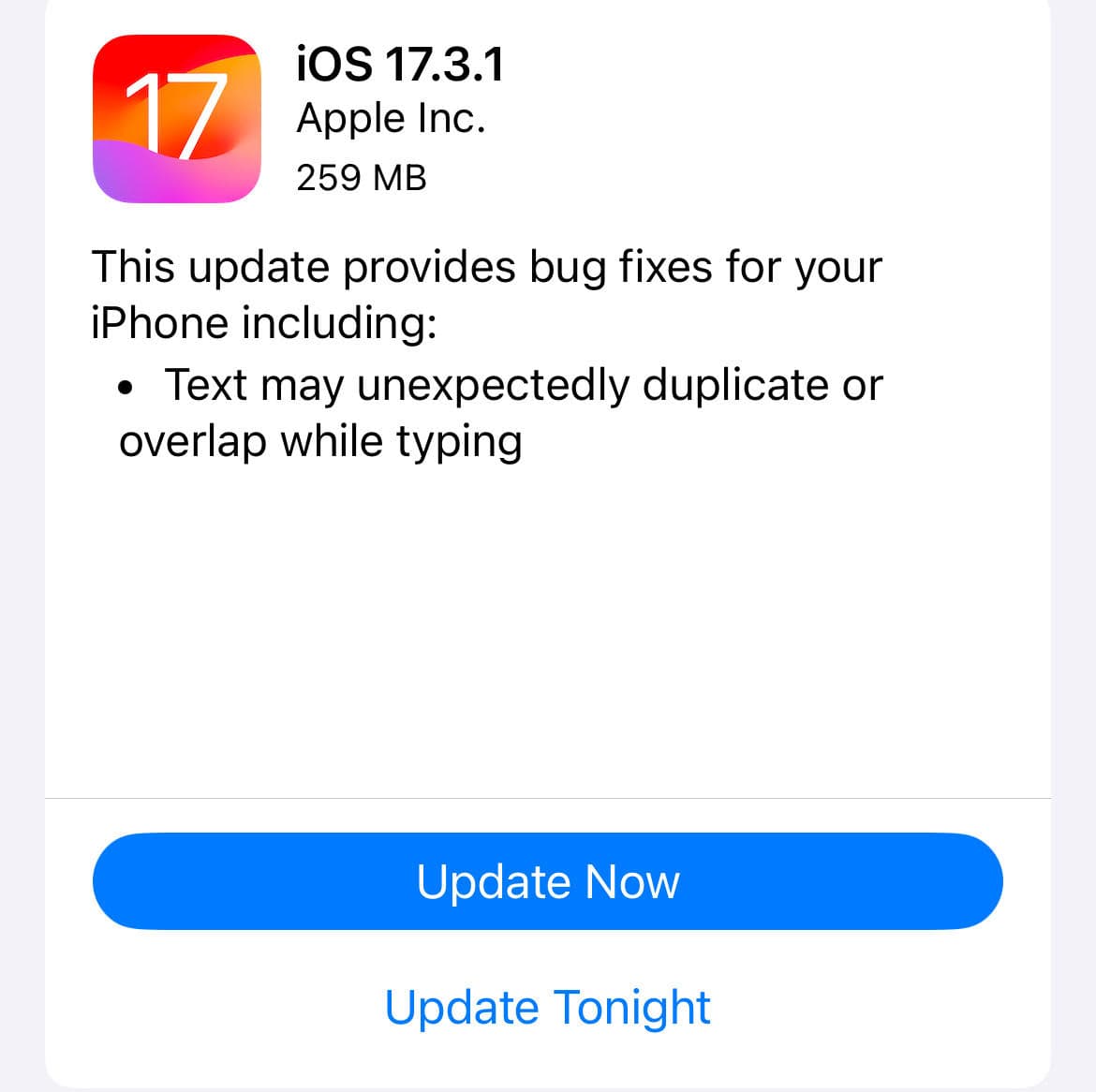 Το iOS 17.3.1 απαιτεί λήψη 259 MB στο iPhone 12 Pro και θα πρέπει να έχει το ίδιο μέγεθος και περίπου για άλλα μοντέλα iPhone.