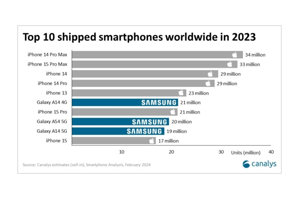 A14 4G με 21 εκατομμύρια και στην έβδομη το iPhone 15 Pro με επίσης 21 εκατομμύρια. Στην όγδοη είναι το Galaxy A54 5G με 20 εκατομμύρια και στην ένατη το Galaxy A14 5G με 19 εκατομμύρια πωλήσεις. Τη λίστα κλείνει το iPhone 15 με 17 εκατομμύρια στη δέκατη θέση.