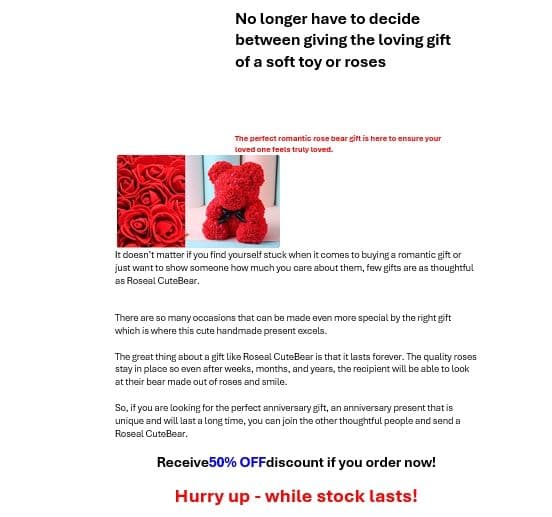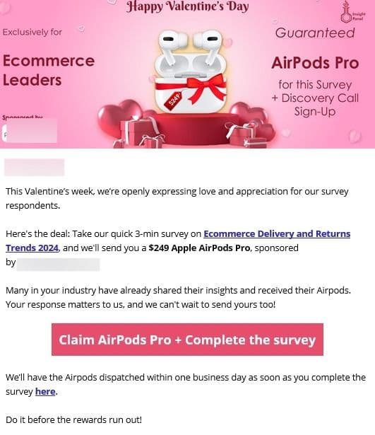 Ορισμένα από τα μηνύματα απάτης με θέμα τον Άγιο Βαλεντίνο που ανάλυσαν οι ερευνητές του Bitdefender Antispam Lab οδηγούν τους παραλήπτες σε ψεύτικους ιστότοπους που προσφέρουν τεράστιες εκπτώσεις σε λουλούδια, αρκουδάκια και σοκολάτες, ενώ άλλα υπόσχονται τεράστια δώρα σε μετρητά, ώστε να μπορείτε να περιποιηθείτε τον αγαπημένο σας την ημέρα του Αγίου Βαλεντίνου.