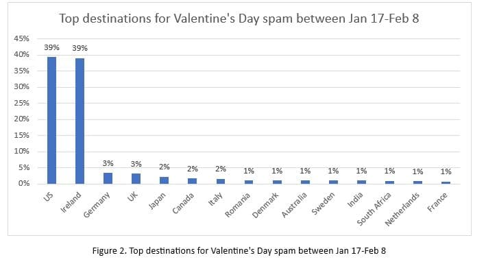 - Οι κυριότεροι προορισμοί για τα spam email για τον Άγιο Βαλεντίνο είναι οι ΗΠΑ και η Ιρλανδία, όπου η καθεμία έλαβε το 39% της αλληλογραφίας. Η Γερμανία και το Ηνωμένο Βασίλειο έλαβαν το 3% των μηνυμάτων spam (Σχήμα 2)