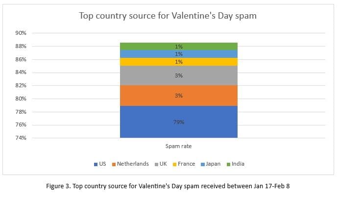 Οι κορυφαίες πηγές IP για την αλληλογραφία spam με θέμα τον Άγιο Βαλεντίνο που ελήφθη περιλαμβάνουν τις ΗΠΑ, την