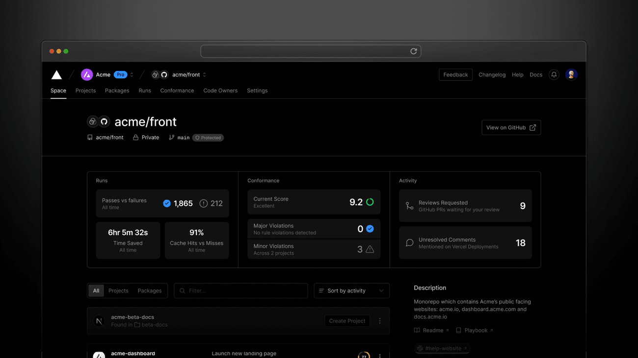 Για τα έργα τους, η εταιρεία αποφάσισε ότι έπρεπε να επανεξετάσει τον τρόπο λειτουργίας της εμπειρίας του ταμπλό για αυτά τα έργα. Αλλά εκτός από αυτό, η εταιρεία πρόσθεσε επίσης χαρακτηριστικά όπως η συμμόρφωση με το Vercel Spaces, το οποίο αναλύει τον κώδικα για κοινά ζητήματα, με βάση τις βέλτιστες πρακτικές που ανέπτυξε η ίδια η Vercel όλα αυτά τα χρόνια.