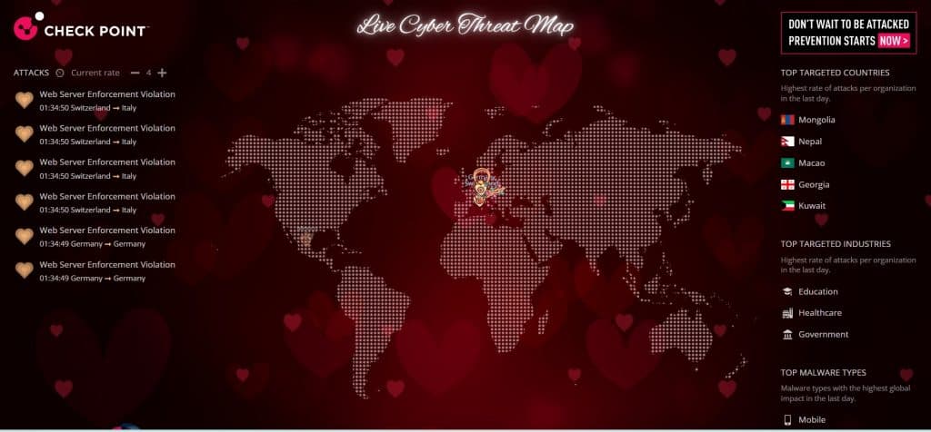 Στο πλαίσιο του εορτασμού της ημέρας, η Check Point έχει ανανεώσει τον χάρτη Live Cyber Threats με το θέμα του Valentine’s day και μπορείτε να το δείτε εδώ: