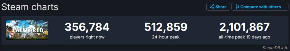 , το Palworld έχει περίπου 1,5 εκατομμύριο λιγότερους παίκτες από το μέγιστο των 2.101.867 παικτών του. Περίπου 356,784 είναι στο παιχνίδι αυτή τη στιγμή, με το 24ωρο peak του να είναι 512,859. Αν και αυτό μπορεί να φαίνεται ανησυχητικό, οι οπαδοί του Palworld δεν έχουν λόγο να πανικοβάλλονται. Το παιχνίδι εξακολουθεί να είναι εξαιρετικά δημοφιλές και παραμένει ένα από τα παιχνίδια με τα περισσότερα παιχνίδια στο Steam, ακόμη και με μια τόσο μεγάλη πτώση.
