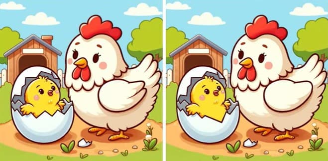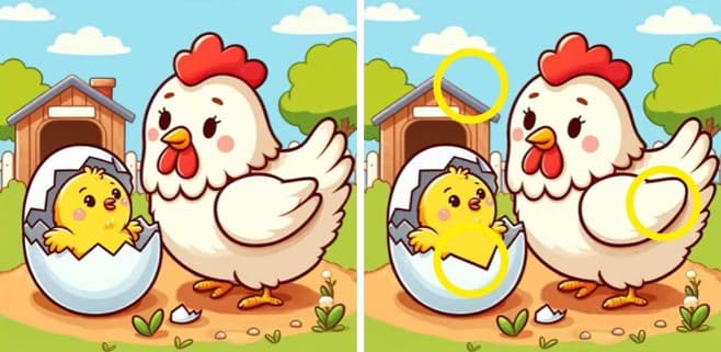Το συγκεκριμένο τεστ παρατηρητικότητας παρουσιάζει δύο πανομοιότυπες εικόνες με μία κότα και ένα κοτοπουλάκι. Οι εικόνες φαίνονται σχεδόν ίδιες, αλλά υπάρχουν 3 διαφορές μεταξύ τους.