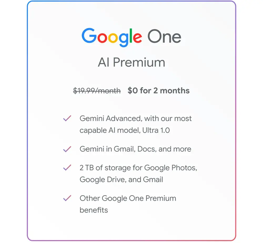 Gemini Advanced, έως 2 TB εσωτερικού χώρου αποθήκευσης και σε άλλες δυνατότητες και πλεονεκτήματα του Google One, με τιμή 19,99 $/μήνα.