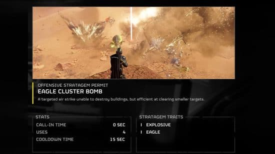 Ξέρετε ότι ένα στρατηγείο είναι ισχυρό όταν έχει περιορισμένο αριθμό χρήσεων. Στην περίπτωση του Eagle Cluster Bomb, ενώ έχετε μόνο τέσσερις χρήσεις για να εξαφανίσετε τους εχθρούς, είναι απίστευτα ισχυρό λόγω της άμεσης κλήσης και του χαμηλού χρόνου ψύξης. Σε μικρότερες αποστολές, αυτό μπορεί να είναι καταστροφικό όταν είστε περικυκλωμένοι από εχθρούς και εξαντλείτε τα πυρομαχικά. Ο σύντομος χρόνος χαλάρωσης σημαίνει ότι μπορείτε να χρησιμοποιήσετε όλες τις Eagle Cluster Bombs σας σε λιγότερο από ένα λεπτό για να καθαρίσετε το πεδίο της μάχης από τους εχθρούς.