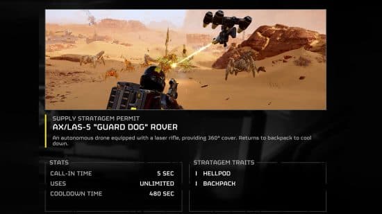 Το Rover «Guard Dog» πετά γύρω από τον χρήστη για να παρέχει κάλυψη 360 μοιρών στο πεδίο της μάχης. Αυτό το drone είναι τεράστιο πόνο όταν παίζεις με τέσσερις παίκτες λόγω της απόλυτης δύναμής του, αλλά είναι τόσο δυνατό που είναι δύσκολο να το αφήσουμε έξω από τη λίστα μας. Αυτό που το καθιστά επικίνδυνο είναι ότι πυροδοτεί ένα ισχυρό τουφέκι λέιζερ που σκίζει εύκολα τους εχθρούς και αν δεν προσέξεις πολύ, θα σκίσει και σε σένα. Αν παίζετε ως δίδυμο, αυτό το στρατηγείο είναι πολύ πιο εύκολο να δικαιολογηθεί, καθώς η δράση από στιγμή σε στιγμή