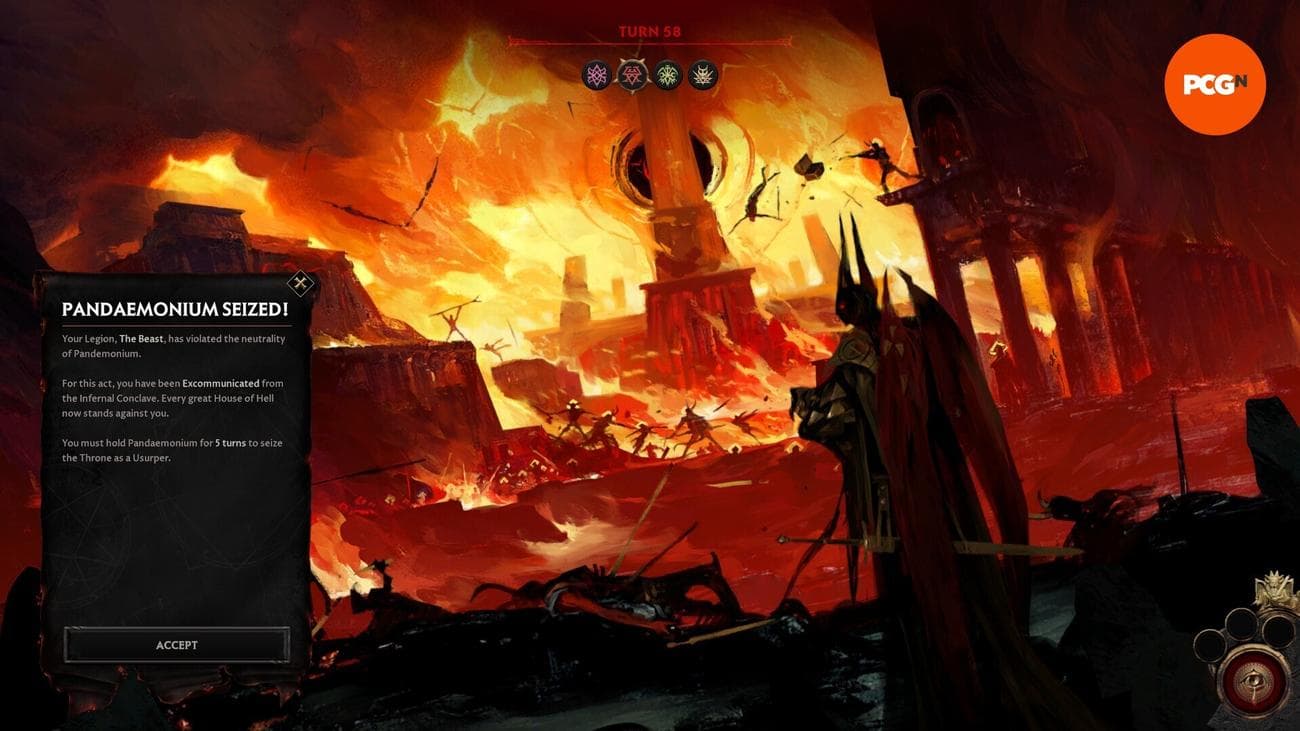 Nevertheless, despite all the ways it encourages you to design and deliberate your own evil plots, Solium Infernum suffers from the same prescriptivity of its genre peers. Especially given their respective strengths and weaknesses, even before you choose your archfiend, you need to decide a specific strategy, and then follow it for essentially the entire game. Experimentation is often dangerous – if you want to be successful, you need to decide on a victory type before you start and throw all of your efforts behind it. The endgame also becomes a little confused. For the most part, Solium Infernum does a terrific job of reducing the bloat and the detritus of other strategy games – there are no unnecessary units. But in the final ten turns, you will find yourself hitting the skip button, and watching your own and other archfiends’ legions walk back and forth around the map, idly taking up time. Fortunately, you can customize the game length.