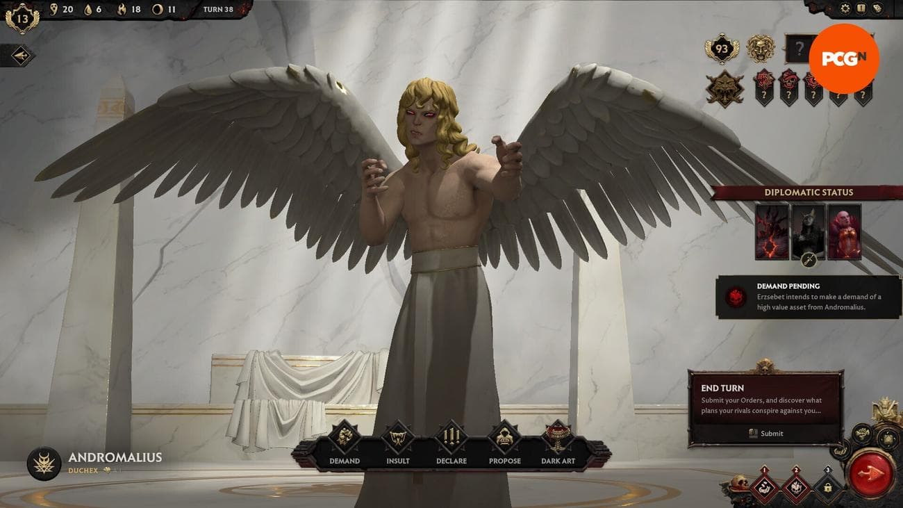 For example, I’m playing as Andromalius, the intensely vain fallen angel possessed by their own ego. My plan is twofold. Before we begin, I choose a relic – items that provide game-long bonuses and status effects – that allows for something called ‘Power Behind The Throne.’ If I court the favor of one of my rival archfiends, make myself their vassal, and guide them to an election victory, when the Conclave proclaims them the new ruler, all of their prestige will transfer to me – they will think they’ve won, but the throne will actually become mine. None of the other archfiends know I have this relic. So, I access the diplomacy screen and send an emissary to Mammon, offering an armistice. Some turns later, Mammon insults Murmur in front of the Conclave, beginning a vendetta between them. Hoping to make Mammon my puppet, I insult Murmur also. My false solidarity seems to have the desired effect, and Mammon offers to share some of his tribute with me.