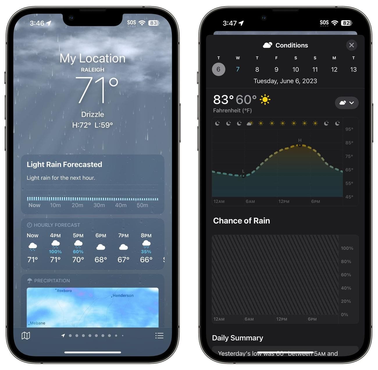 Ορισμένες από τις πληροφορίες καιρού έχουν μεταφερθεί, με τις βροχοπτώσεις και τις ωριαίες προβλέψεις να εμφανίζονται πρώτα. Οι ειδήσεις και οι ειδοποιήσεις εμφανίζονται χαμηλότερα στην εφαρμογή και υπάρχει μια νέα μονάδα καιρού “Μέσοι όροι” που εμφανίζει πώς η τρέχουσα θερμοκρασία αποκλίνει από τον ιστορικό μέσο όρο εκείνης της ημέρας.