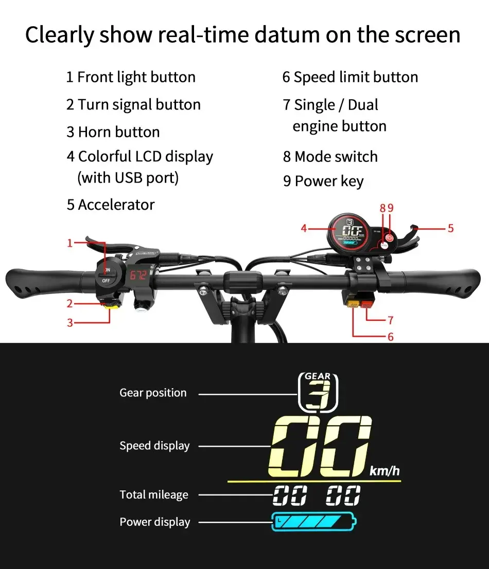 κλειδαριά με κλειδί, οθόνη ενδείξεων, κόρνα, κουμπιά για την απομόνωση του ενός από τους δυο κινητήρες, και τα