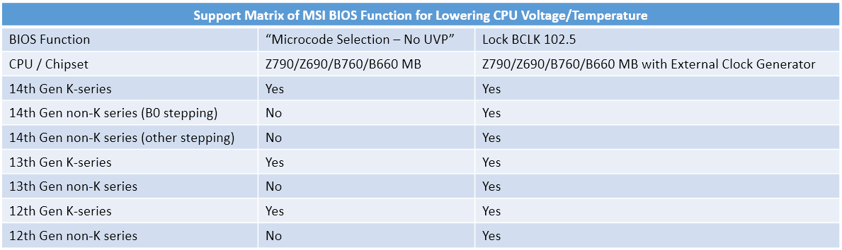 Τα χαρακτηριστικά περιλαμβάνουν “Επιλογή μικροκώδικα – Χωρίς UVP” και “Κλείδωμα BCLK 102.5” που κάνουν ακριβώς αυτό που υποδηλώνει η ονομασία. Ακολουθεί η πλήρης λίστα των μητρικών μαζί με το αντίστοιχο BIOS που έχουν λάβει την ενημέρωση: