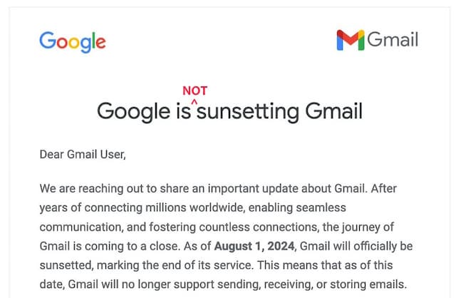 : Μπορεί να βρίσκεστε εδώ επειδή ακούσατε ότι η Google «πέφτει το ηλιοβασίλεμα στο Gmail» φέτος, όπως το λέει μια φάρσα που διαδίδεται γρήγορα στο διαδίκτυο. Η φάρσα φέρεται να δείχνει ένα μήνυμα ηλεκτρονικού ταχυδρομείου από την Google που λέει ότι “το ταξίδι του Gmail πλησιάζει στο τέλος”. Ακολουθεί μια έκδοση που εντοπίσαμε στο Twitter/X: