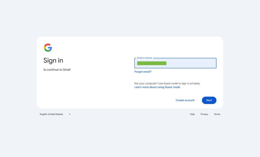 Αντί η σελίδα να είναι κεντραρισμένη στην επιφάνεια εργασίας, η Google τοποθετεί το πεδίο κειμένου email/τηλεφώνου στα δεξιά, ενώ ένα λογότυπο Google και άλλες πληροφορίες εμφανίζονται στα αριστερά.