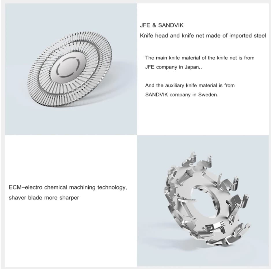 Η βασική κεφαλή της, αποτελείτε απο τρείς στρογγυλές λεπίδες οι οποίες έχουν ανεξάρτητη κίνηση για να αγκαλιάζουν τις γωνίες της φατσούλας σας και είναι κατασκευασμένες απο ατσάλι της JFE&SANDVIK , που για να το διαφημίζουν, σημαίνει οτι μάλλον ειναι καλό.
