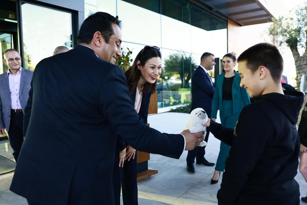 Η Υπουργός Γεωργίας, Αγροτικής Ανάπτυξης και Περιβάλλοντος της Κύπρου Μαρία Παναγιώτου και ο Δήμαρχος Πέγειας Μαρίνος Λάμπρου μαζί με έναν μικρό φίλο της θαλάσσιας φώκιας,