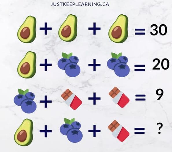 , αντικαθιστούμε στην πράξη το αβοκάντο με τον αριθμό 10 και ονομάζουμε τα μούρα ως Χ. Άρα η πράξη παίρνει την εξής μορφή: