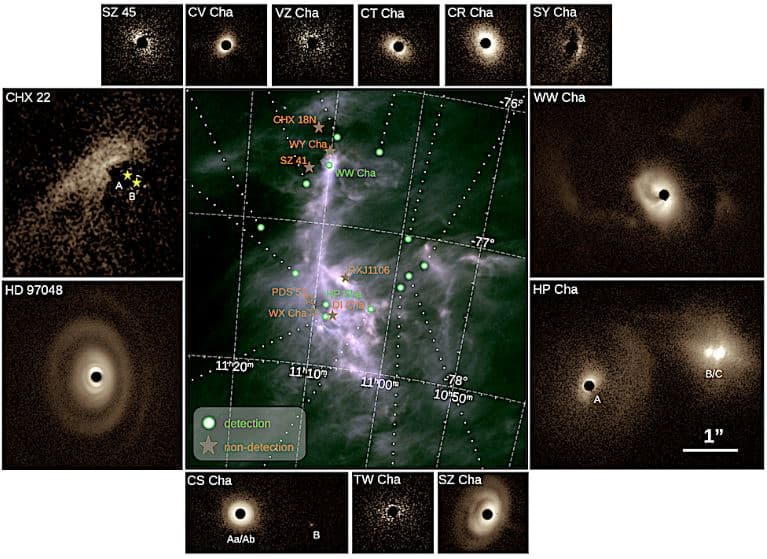 Για την παρατήρηση των δίσκων η ομάδα χρησιμοποίησε το εξελιγμένο όργανο SPHERE που είναι τοποθετημένο στο VLT, το οποίο αποδίδει ευκρινείς εικόνες των δίσκων. Έτσι, η ομάδα μπόρεσε να απεικονίσει δίσκους γύρω από αστέρια με μάζα μόλις το μισό της μάζας του Ήλιου, οι οποίοι είναι συνήθως πολύ αχνοί για τα περισσότερα άλλα όργανα που είναι διαθέσιμα σήμερα. Πρόσθετα δεδομένα ελήφθησαν με τη χρήση του οργάνου X-shooter του VLT, το οποίο επέτρεψε στους αστρονόμους να προσδιορίσουν πόσο νέοι και πόσο μαζικοί είναι οι αστέρες. Επιπλέον, η διάταξη ραδιοτηλεσκοπίων ALMA στην έρημο Ατακάμα βοήθησε την ομάδα να κατανοήσει περισσότερα για την ποσότητα σκόνης που περιβάλλει ορισμένα από τα αστέρια.